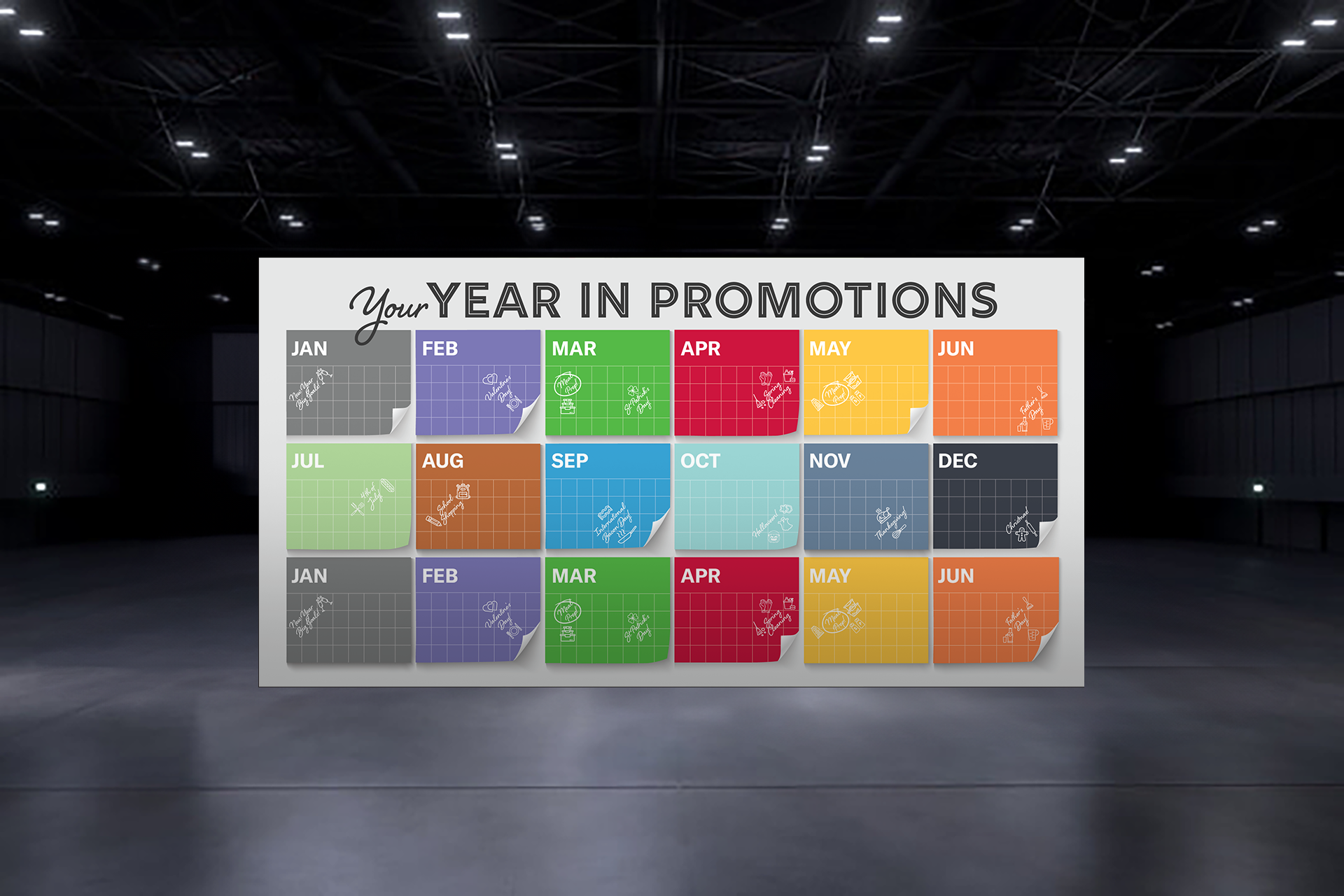 A year in promotions calendar was designed to promote different products for specific times of the year. Product displays were placed on different colored stands that matched the calendar so that viewers could connect which ones would benefit their business most.